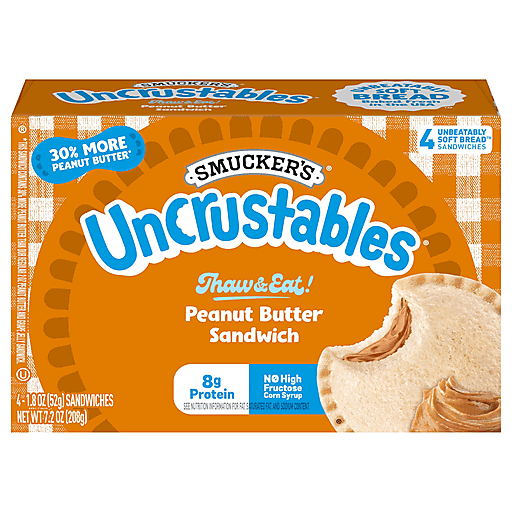 Make busy days a little more doable with Uncrustables — the easiest kid-approved snack and lunch food ever. Just grab one from the freezer in the morning, and it's thawed and ready to make your kid's day by lunchtime. No fuss. No crust. Just The Best Part of the Sandwich, with the yummiest tastes and textures. The outside of is surprisingly soft white bread, and the inside is packed with 30% more peanut butter than our regular 2 oz. peanut butter and grape jelly sandwich. Wondering how a frozen sandwich could possibly be so delicious? The bread is baked fresh in the U.S.A., and the sandwiches are frozen on the spot to seal in that just-made taste. They also contain no high-fructose corn syrup. Basically they’re super-convenient snacks and lunch foods you can feel good about, and that kiddos will happily eat. Try the Uncrustables Peanut Butter Sandwich.